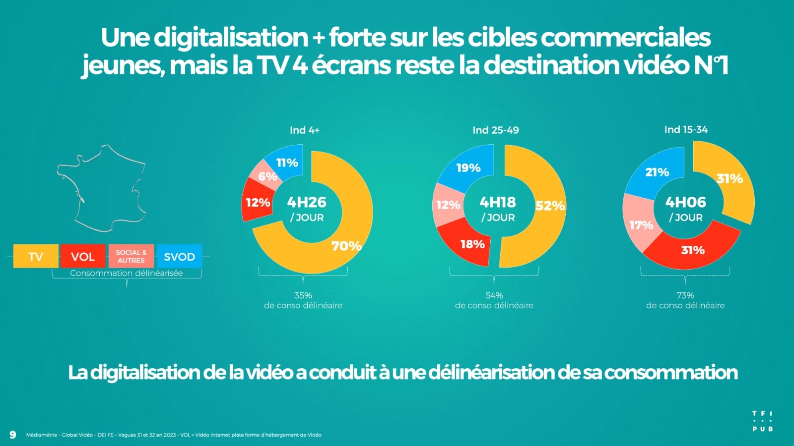 Selon l’étude Médiamétrie Global Video 2023, basée sur des données déclaratives, le linéaire ne représenterait qu’un peu plus de la moitié du temps de consommation vidéo des Français de 25 à 49 ans, quel que soit le device utilisé, l’autre moitié se partageant entre la SVOD (des plateformes comme Netflix ou Disney+), la VOL (Vidéo On Line, dont YouTube) et les plateformes sociales. Ce même linéaire représenterait moins du tiers du temps passé chez les 15/34 ans