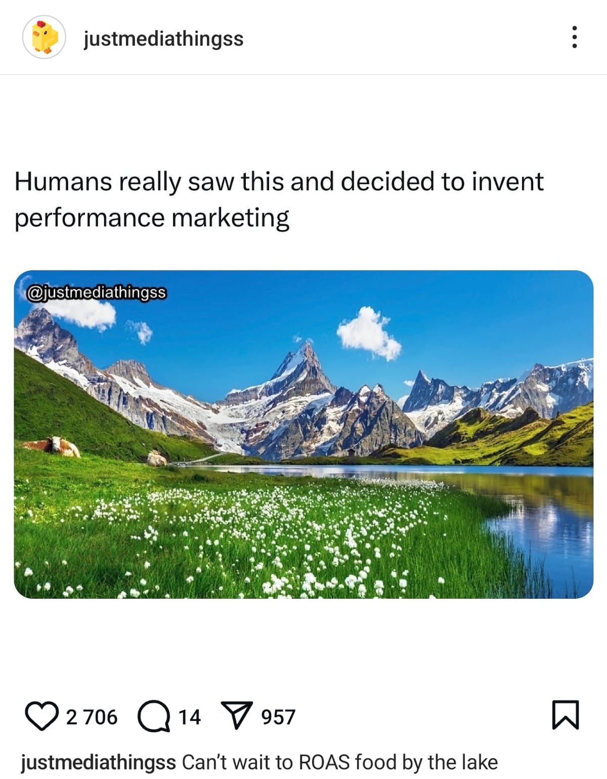 🌿 “Les humains ont vraiment vu cela et ils ont décidé d’inventer le marketing à la performance”. Tel est l’excellent dernier post du compte de memes liés à la vie en agence média : Just Media Things.